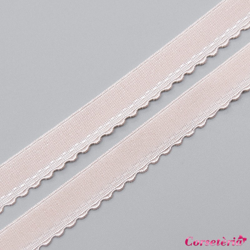 Декоративная резинка бежево-розового оттенка "серебристый пион" шириной 14 мм с ажурным фестоном и миниатюрным орнаментом по одной стороне - используется для пошива нижнего белья в качестве отделки.
