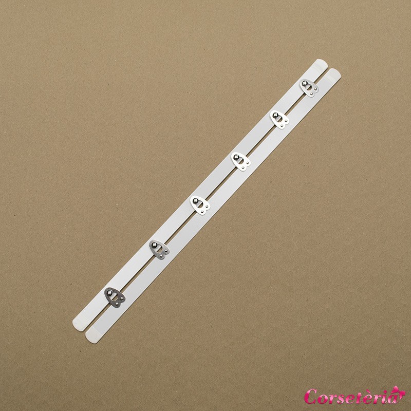 Металлический бюск длинной 32 сантиметра для застежки корсетов с шестью крючками и кольцами, бюск изготовлен из нержавеющей стали покрытой белой краской. Немецкое качество.