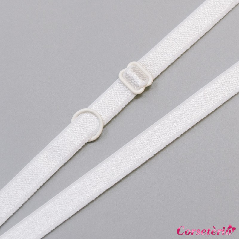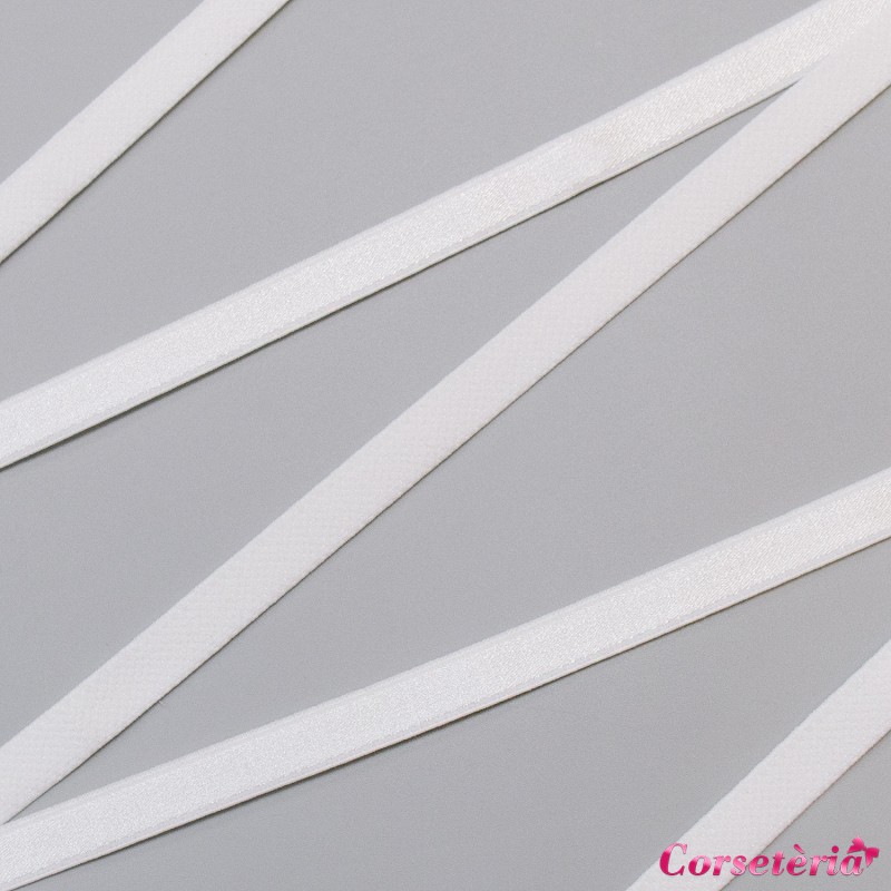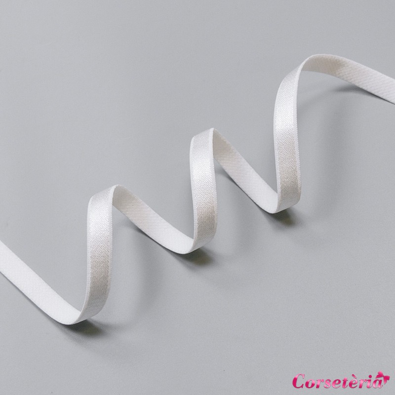 Эластичная тесьма молочно-белого оттенка шириной 10 мм, имеет легкий атласный блеск на лицевой стороне и чуть "рифленую" поверхность, используется для обработки бельевых изделий в качестве бретели.